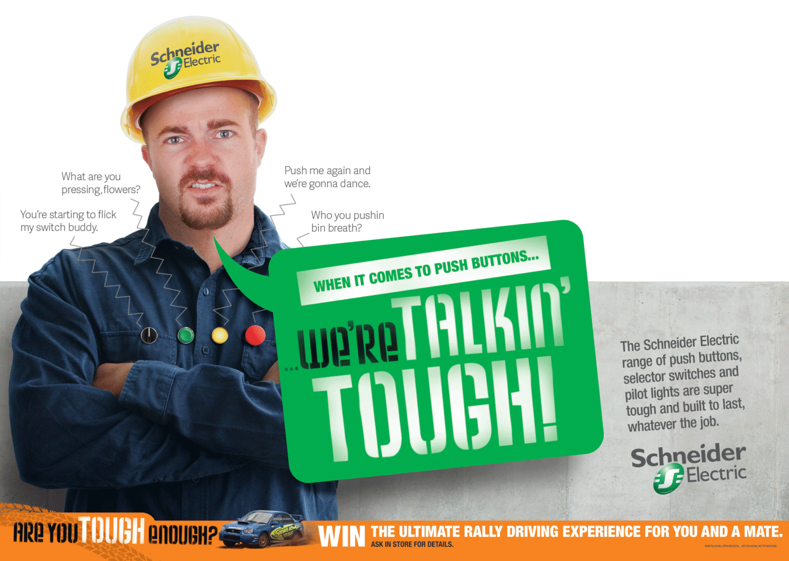 Known for their high quality push buttons and switches, built to last for all applications, Schneider Electric began to see a dip in sales. Research showed that tradesmen and engineers were choosing competitive brands based on lower pricing not quality. They needed to get into Point-of-purchase and regain awareness that their products were the best, providing longevity and less callbacks. I developed a creative interactive POS piece to tap into the target market with tongue-in-cheek humour delivering the message – when it comes to push buttons, our product is the toughest out there. Real buttons were housed in the POS that produced tough talking sound bites when pressed.